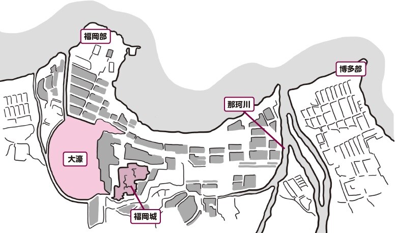 博多は玄界灘をはさんで朝鮮半島の眼前に位置し、海岸線は開放的なため、外敵の侵入が容易です。一方、現在の市街地は、江戸時代以降の埋め立てによって形成されているため、土地は水はけが悪く浸水しやすいです。さらに、那珂川などの小さな川はありますが、大きな河川がなく、都市生活をまわすためのエネルギーである薪や食糧を搬入することも困難でした。