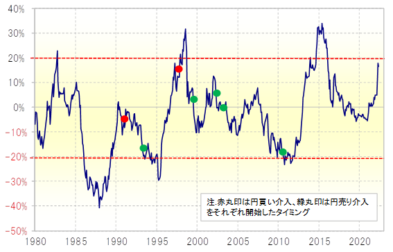 米ドル/円の5年MAは足元で110円程度なので、135円まで米ドル高・円安が進んだ場合は、5年MAかい離率がプラス20%を大きく上回る計算になります。1990年以降で、同かい離率が±20%以上に拡大した4回のケースでは、うち3回について為替介入が行われました(図表6参照)。