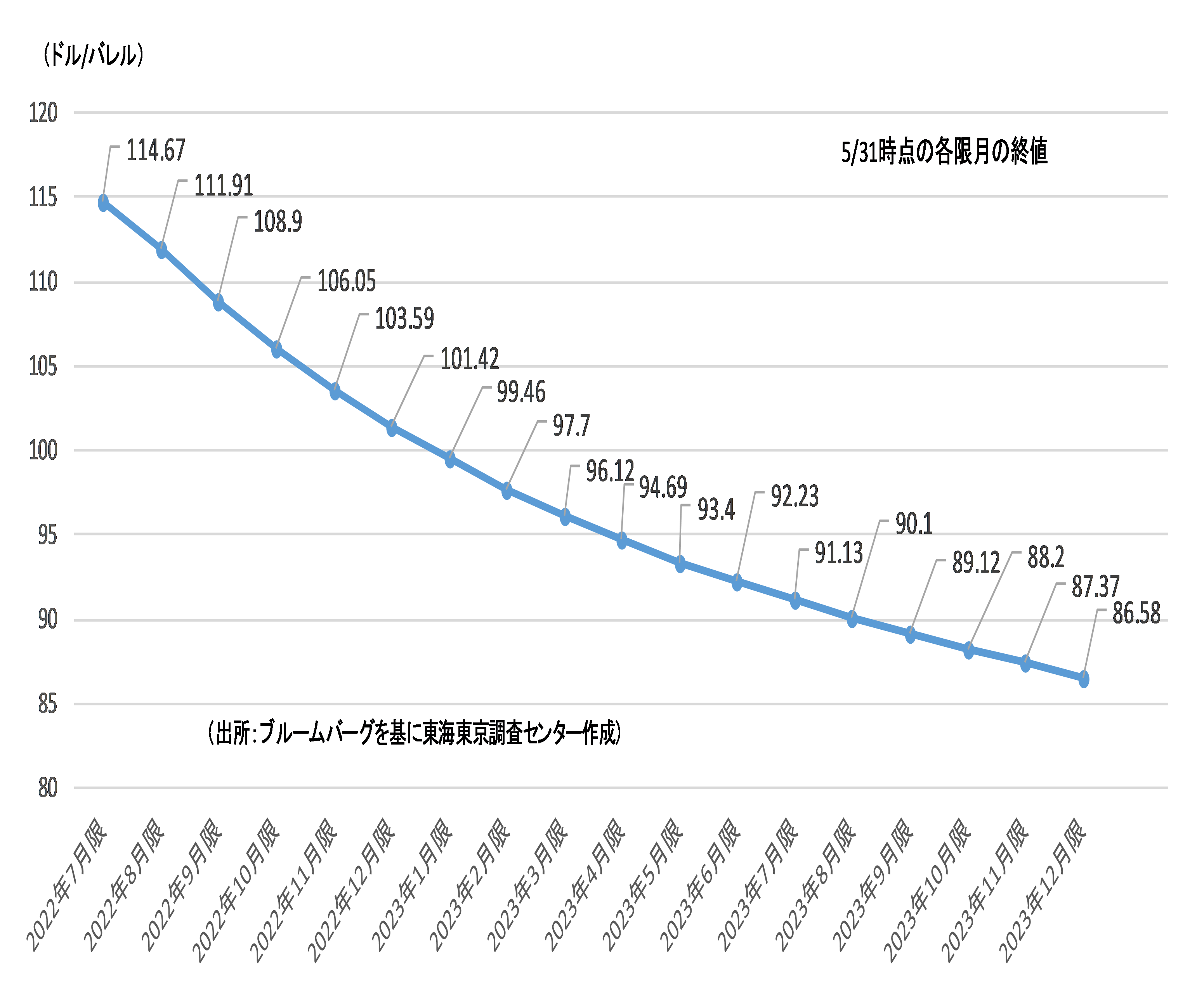 5月31日時点の原油価格のフォワードカーブ(先物曲線)をみると、引き続きバックワーデーション、つまり期先物より期近物のほうが高い状態となっている。