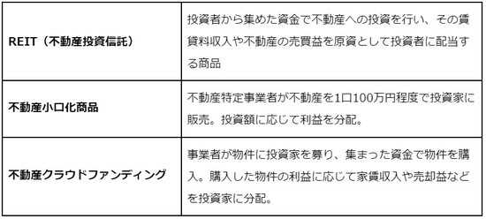 小額不動産投資は主に下記の3つで、どの投資方法も少額から始められます。