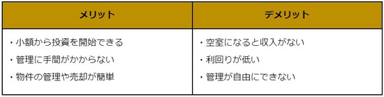 デメリットは、自分で投資物件を選定できないため、投資先が限られることです。また手数料がかかり利益率が低くなる可能性もあるため、大きく収益を得たいという方にはあまりおすすめできません。