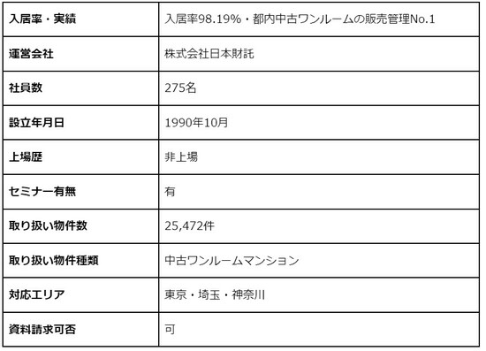 日本財託は、東京都をメインにマンションに特化した不動産投資信託会社です。入居率が高く、販売から管理、運営まで一貫したサービスを提供しています。