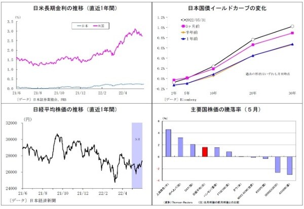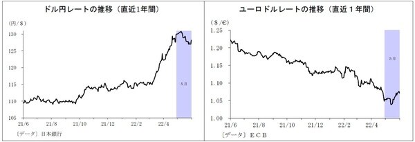 月初、インフレ・利上げ加速観測に伴う米金利上昇を背景にドルが買われ、9日には130円台後半に上昇(一時131円台に)。その後は持ち高調整や米金利上昇一服に伴うドル売りが入り、13日には128円台後半に下落。しばらく横ばい圏での推移を挟んだ後、利上げ等に伴う米景気減速懸念が台頭し、20日には127円台後半に。さらに25日には127円へと下落した。一方、月末には上海の都市封鎖解除方針などからリスク回避がやや緩和したほか、FRB高官が積極的な利上げ継続方針を示したことで米金利が上昇し、128円台前半に持ち直した。