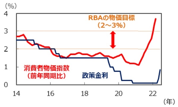 ■RBAは、大幅な利上げの背景として、インフレの上昇をあげています。RBAは、コロナ禍のサプライチェーンの混乱やウクライナ情勢の他、豪州国内で今年発生した洪水や労働市場のひっ迫などの影響を指摘しています。また、電気・ガス料金やガソリン価格の上昇などにより、短期的には想定以上のインフレとなる可能性があるとみています。