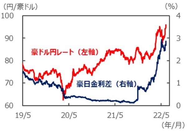 ■5月に続き、市場予想を大幅に上回る利上げとなったことから、金融政策決定会合後の為替市場で豪ドルは対円・対米ドルともに強含み、対円で一時96円台をつけました。RBAは、ウクライナ情勢や中国経済の不確実性による世界経済やコモディティ価格への不透明感を警戒しつつも、今後も金融政策正常化に向けてさらなる措置を取るとしており、今後も複数回の利上げが見込まれます。