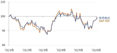 (注)データ期間:2022年1月1日~2022年6月3日、日次。トータルリターン(配当を含む)。「世界株式」:MSCIACWorld Index。