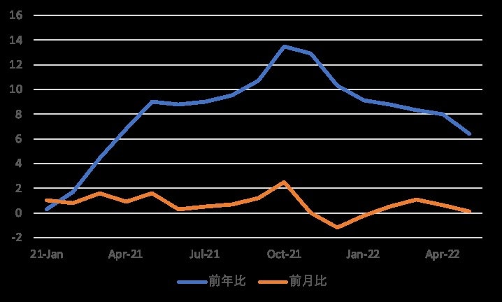 中国国家統計局が10日発表した5月の消費者物価指数(CPI)は前月の伸び率と変わらず前年比2.1%上昇(前月比▲0.2%)、市場予想の2.2%を下回った。生産者物価指数(PPI)については前年比6.4%上昇(前月比+0.2%)と21年3月以来の低い伸びとなり、前月の8.0%から減少した。