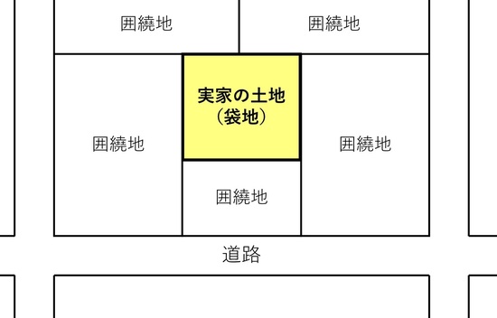 今回のように、他人の土地などに囲まれ、道路と接していない土地のことを「袋地」といいます。建築基準法上、道路に接していない土地に建物を建築することはできません。そのため、Aさんの実家は、古い建物を取り壊したあとに、新しく建物を建築できない状態になっていました。