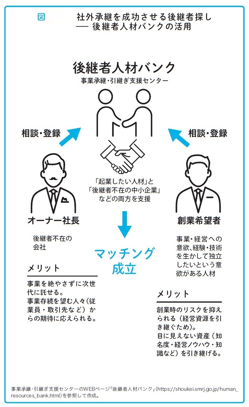 社外承継の相手を探す際は、公的機関にサポートを依頼する方法もあります。その一つが、国が設置する公的相談窓口の「事業承継・引継ぎ支援センター」です。同センターは各都道府県に設置され、中小企業や小規模事業者の親族内承継や経営者保証などに関する支援を行っていて、そこには第三者承継や後継者人材バンクといった事業も含まれています。