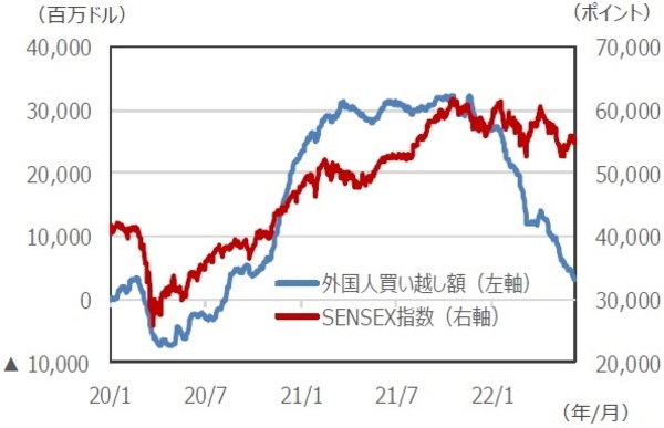 ■インド株市場への海外資金フローをみると、コロナショック後の20年5月以降海外投資家はインド株への投資を積極化し、大幅に買い越しましたが、今年に入ると、一転して大幅な売り越しに転じています。年初来では238億ドルと、大幅な売り越しが継続しています(6月9日時点)。