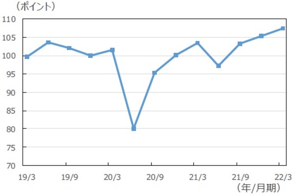 ■弊社で季節調整を行い、コロナ禍以前の19年10-12月期を基準(=100)に指数化したところ、22年1-3月期には107.4と、コロナ禍以前の水準を3四半期連続で上回り、かつ、上昇傾向を示しました。さらに、4-6月期には、昨年の感染拡大時との比較によるベース効果で、前年同期比成長率は2桁増が見込まれます。