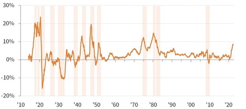 米国のCPIインフレ率(前年同月比)の長期データは1914年から取得できます。図表2に示すとおり、その1914年から直近までの約108年間のなかで、インフレ率がピークから「6.6%ポイント」程度の幅で大幅に低下した局面は13回あります。