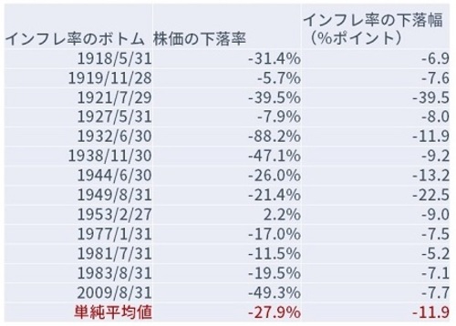 図表3のとおり、その13回の「インフレ率大幅鈍化の局面」を見ると、米国株価のピークからボトムまでの平均下落率は「約28%」です。言い換えれば、株価がピークから3割ほど下落すれば、それが、インフレ率の収束につながるかもしれません。