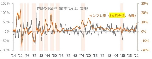 いうまでもなく、そのような「インフレ率が大幅に低下する局面」の多くでは、需要の減少(≒景気の減速や後退)が見られており、株価の下落が、景気減速やインフレ率鈍化に先立って生じています。