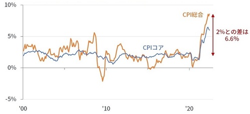 FRBが見ているのは「PCEコア・インフレ率」ですが、仮に「CPI総合」で考えると、「現在+8.6%」のインフレ率はここから、「6.6%ポイント」低下しなければ、長期のインフレ目標の「+2%」には到達しません(→実際には、CPIインフレ率はPCEインフレ率と比べて「上方バイアス」があることが知られています)。