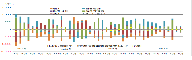 一方、個人は5ヵ月連続の売り越し。法人は3月、4月で大きく売り越した後、5月は133億円の買い越しに転じた。