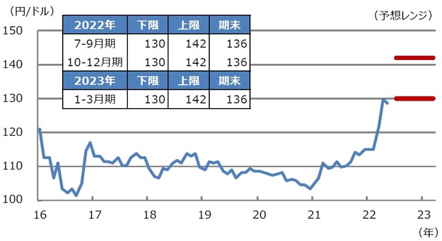 これまで、年内の予想レンジは1ドル=125円~137円、年末着地は131円としていましたが、今回、年内の予想レンジは1ドル=130円~142円、年末着地は136円に設定しました(図表1)。