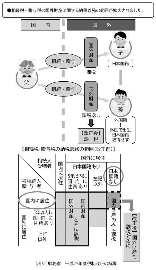 これを防止するために、平成25年の改正で、受贈者が外国籍であっても贈与者が国内に居住している場合は、国外財産に対しても課税されることになりました。