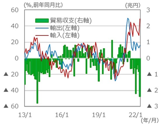 ■名目輸出額は前年同月比+15.8%と堅調でしたが、名目輸入額が同+48.9%と大幅に増加し、『貿易赤字』の額は大きく拡大しました。名目輸入の数量指数を見ると同+4.7%だったものの、エネルギーや食料品などを中心に輸入品の価格が上昇していることや、足元で円安が進行していることによって輸入金額は大きくなりました。