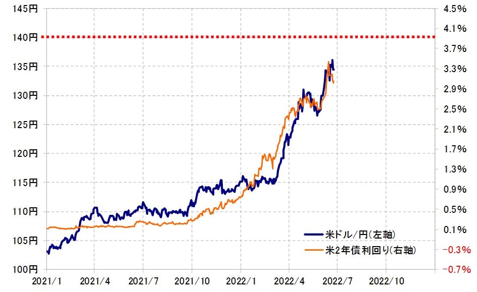 米ドル/円と米2年債利回りのこれまでの関係を前提にすると、米ドル/円が140円を超えるまで一段と上昇するためには、米2年債利回りが4%以上に一段と上昇することが必要と考えられます(図表5参照)。