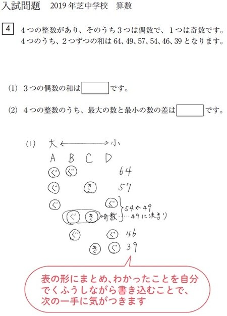 「書く・スロー学習」で最も忘れてほしくないのは、問題文をヒントに自分の手を動かして試行錯誤することです。どのようにすれば、書いて学習内容をより深く理解できるようになるのか、次の図表の芝中学(2019年)の算数の入試問題を例に紹介します。