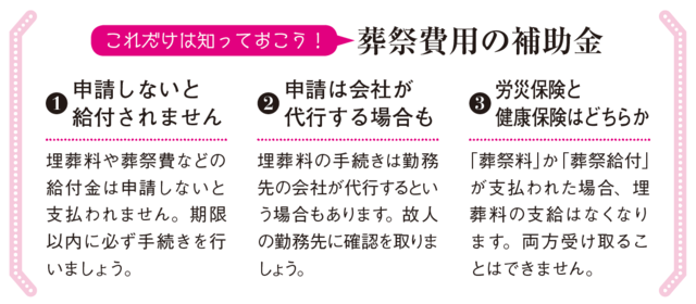 故人が退職などで被保険者としての資格を失っていても、失効から3カ月以内に亡くなった場合は埋葬料の給付対象です。また、業務上災害や通勤災害で亡くなった場合は埋葬料ではなく、労災保険から葬儀費用が給付されます。