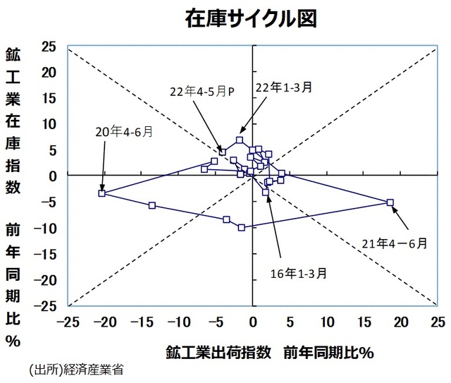 ●鉱工業全体の在庫循環の動きをチェックするために、縦軸に鉱工業在庫指数・前年比、横軸に鉱工業出荷指数・前年比をとった在庫サイクル図をつくると、20年10~12月期、21年1~3月期では「意図せざる在庫減局面」になっていた。4~6月期では「在庫積み増し局面」に入った。7~9月期では引き続き「在庫積み増し局面」となった。10~12月分では在庫が前年同期比+4.9%、出荷が前年同月比0.0%の伸び率になり、「在庫積み上がり局面」となった。22年1~3月期では在庫が前年同期比+6.8%、出荷が前年同期比▲1.8%の伸び率で引き続き「在庫積み上がり局面」となっていた。今回4~5月分では在庫が前年比+4.6%、出荷が前年比▲4.0%の伸び率で、「在庫積み上がり局面」継続となった。なお、部材調達不足などによる生産の減少による影響が含まれていることなどを考慮することが必要な局面であろう。