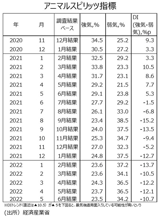 ●経済産業省は製造工業生産予測指数からアニマルスピリッツ指標を作成している。21年6月調査結果で、アニマルスピリッツ指標(生産活動マインド指標:DI)は10ヵ月連続のプラスの数値となり、企業の生産マインドは強気超の状況が続いていたが、21年7月~22年6月調査結果ではDIは12ヵ月連続のマイナスになっている。22年6月調査結果のDIは▲10.7である。22年5月調査結果のDI▲12.1からマイナス幅が縮小した。