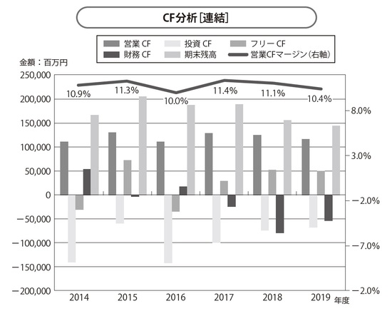 営業CFは、稼ぐ力を示していますから、売上高に対して一定程度の額・割合が必要です。営業CF÷売上高を営業CFマージンといいますが、メーカーのような競争力維持のための投資が必要な企業では、10%以上が目安とされます。営業CFマージンの推移を見ると、自社の稼ぐ力の変化が掴めるわけです。