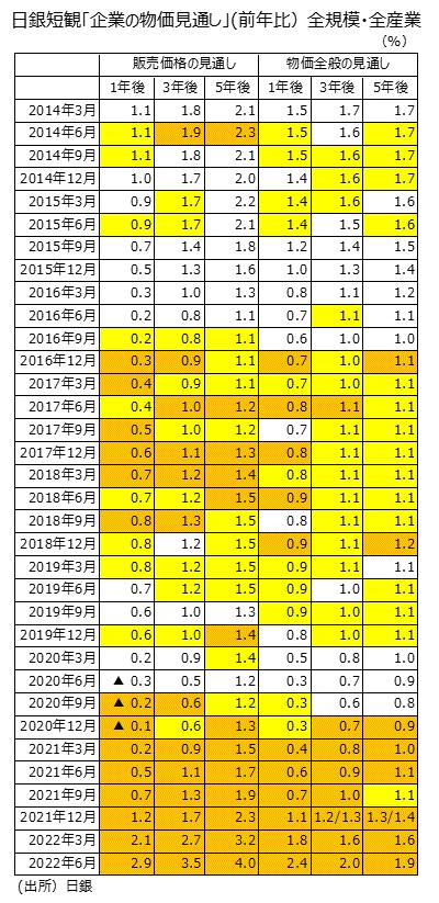 企業の物価見通し、全規模・全産業6項目全てで、初の3調査連続・上昇率アップ