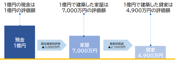 「相続税は、故人から財産を受け取った場合に、その財産の合計額に対してかかる税金です。税率は累進課税制度に基づいて計算されるので、総額が高いほど高くなります。現金の相続税評価額は額面通りの金額になりますが、不動産の場合、建物については自宅の場合が、相続税評価額=固定資産評価額となるのが通常で、建築費の約7割程度の評価になります。さらに建物が賃貸マンションや賃貸アパートであれば、さらに賃家評価減で7割程度になります」