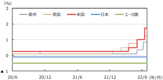 FRBは、6月の米連邦公開市場委員会(FOMC)でフェデラルファンド(FF)金利の誘導目標を0.75~1.00から1.50~1.75%へ、0.75%引き上げました。また、FOMC参加者による2022年末時点の政策金利見通しは、中央値が3.375%に切り上がりました。パウエル議長は記者会見で、7月の会合でも0.5~0.75%の利上げの可能性を示唆しました。ECBは6月の理事会で、主要政策金利を据え置く一方、量的緩和政策を7月1日に終了することを決めました。また、7月に0.25%の利上げに踏み切ることを声明文に明記しました。日銀は6月の金融政策決定会合で、大規模な金融緩和策を維持しました。声明文で為替市場を注視すると明記しました。