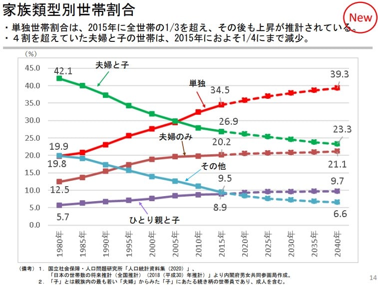 1980年(昭和55年)に4割を超えていた夫婦と子どもからなる核家族の世帯は、2015年(平成27年)までの35年の間に15.2%減少しており、全世帯のおよそ1/4にまで減少しています。一方で、単独世帯は同じ期間で14.6%増加しており、全世帯の1/3を超えています。