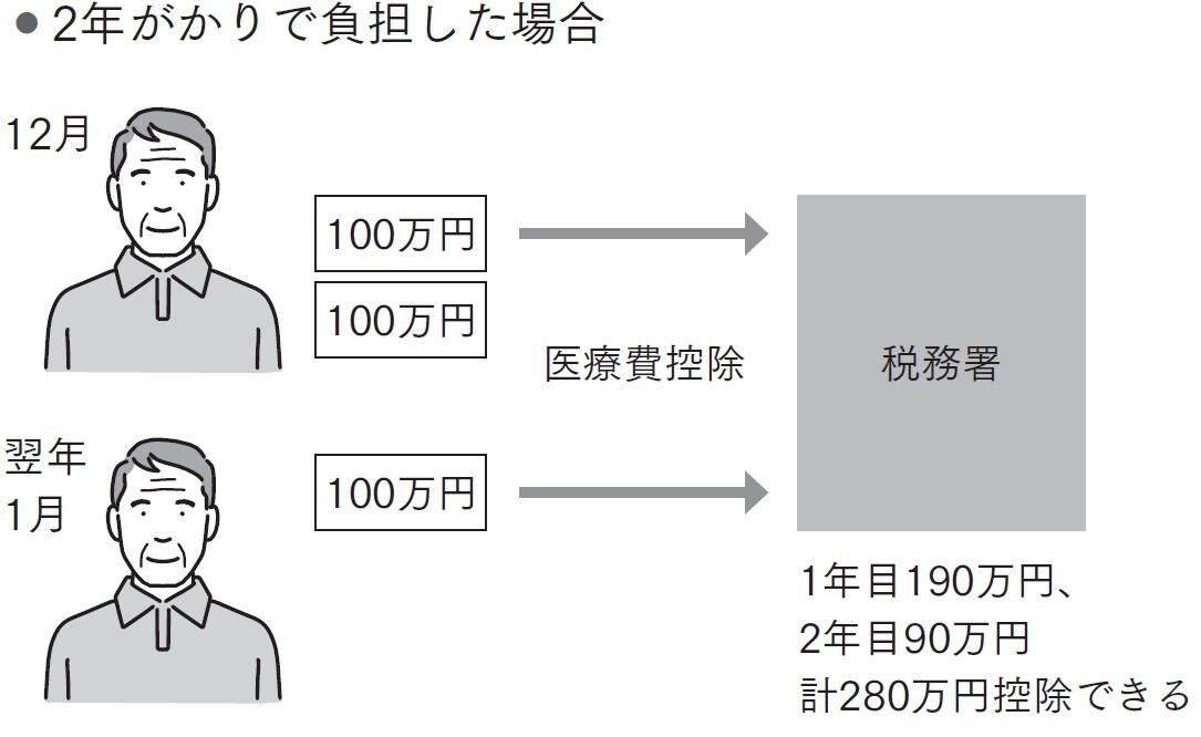 たとえば前年12月に200万円、今年1月に100万円を支払ったら、今年の確定申告(前年分)の医療費として200万円、来年の確定申告(今年分)の医療費として100万円が申告できます。先ほどの夫婦の例と同じく、所得税率10%、住民税10%だった場合、節税できる金額の合計は約40万円から約58万円になります。