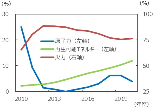 ■現在起こっている『電力不足』の背景には、電源構成における再生可能エネルギー(再エネ)へのシフトが関係しています。電力各社は太陽光発電の普及を受けて古い火力発電所の休止や廃止を順次進めており、日本の電源構成に占める再エネのウエイトは東日本大震災前の2.2%から、2020年には12.0%まで上昇しています。