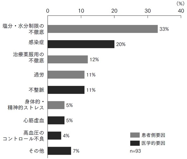 ステージCまで進んでいて、いったいなぜ心不全が再発してしまうのかという原因を探ったところ、ある研究によれば次のような結果になることが分かりました。つまり、心不全で再入院する原因の約3割が、「塩分・水分制限の不徹底」であり、日々の食事が原因で再発を招いているといえるのです(図表1)。