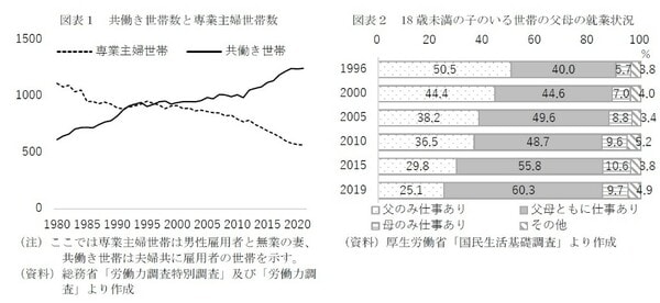 夫婦共働き世帯が増える中で2017年に同名のレポート*1を発信した。その後も「女性の活躍推進」政策等の効果によって、共働き世帯数は全体で見ても子育て世帯でも増加している(図表1・2)。