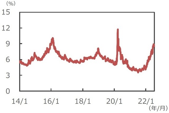■足元の米ハイイールド社債市場の平均利回りは8%台半ばで推移しており、過去10年間の平均約6%を2%以上上回っています。FRBの急速な金融引き締めで金融市場はしばらくボラティリティの高い状況が続くとみられるものの、米ハイイールド社債の高い金利収入は、価格変動のクッション役として作用することが期待され、注目に値すると思われます。