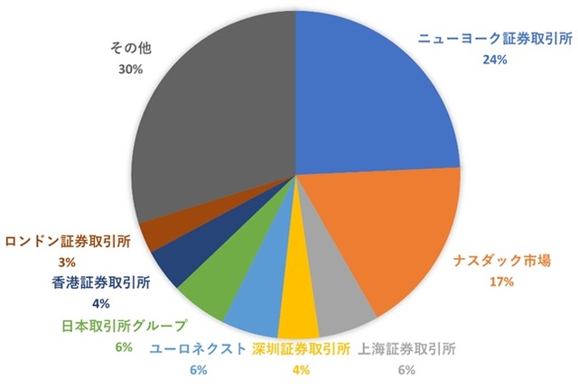そして図表2のとおり、アメリカの株式市場の時価総額シェアは約41%(ニューヨーク証券取引所24%+ナスダック市場17%)と、まだまだ圧倒的なシェアを誇っています。