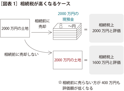 まず一つは、現預貯金の状態で相続してしまうと、不動産のままでもっていた場合に比べて、相続財産が高く評価されてしまうという点です。たとえば、被相続人が生前に、時価で2000万円と評価される土地をその額で売却したとします。その後相続が発生すれば、この場合、2000万円の現預貯金は、100%のまま、つまり2000万円として評価されることになります。