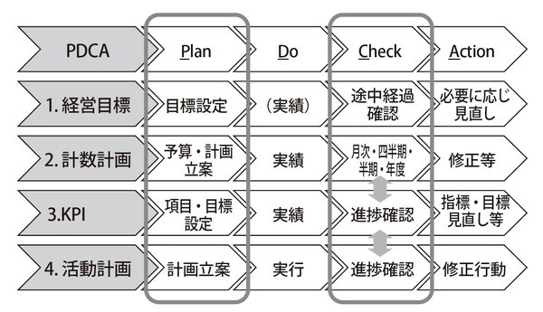 経営目標や計数計画は、会計値であることが多いため、経理部門の集計により進捗管理が行えます。しかし、KPIは通常の業務活動または情報システムで把握できるようになっていないものもあり、そうした際には別途KPIの推移が把握できるようにする必要があります。