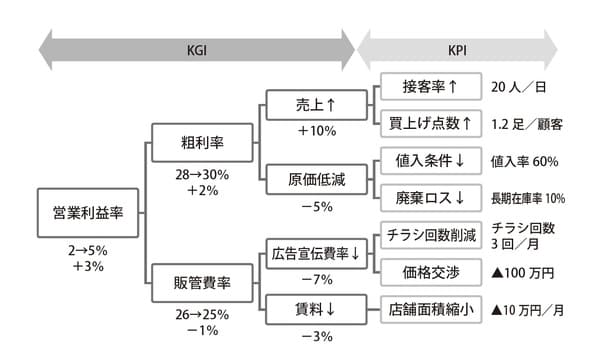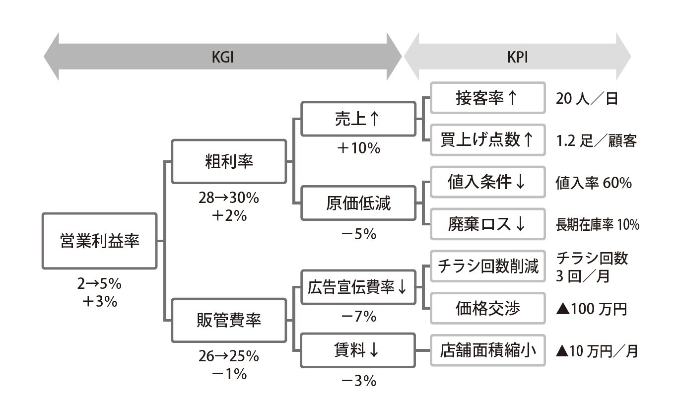 経営目標や部門目標、特定の課題の目標のことを指しています。例えば経営目標の場合、次の図のように営業利益率を2%から5%に3%増やしたいとします。この目標を達成するために、粗利益率をアップするとともに、販管費率を下げることとします。