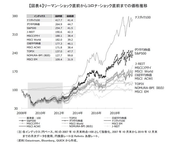 各国の中央銀行も非伝統的な金融政策、つまり、大規模な資産買入れ(FRBはMBS、日銀はETF、J-REIT等)等を実施した。その後、2016年に英国EU離脱国民投票、2018年に米中貿易摩擦等のリスクが顕在化し、株式インデックスはその度に下落したものの、その後に総じて上昇した。