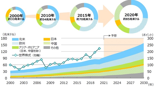 (注2)世界株式は2000年12月末〜2020年12月末、MSCI ACワールドインデックスの年末値。2000年12月末を100として指数化。