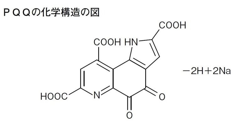 PQQとはピロロキノリンキノン(pyrroloquinolinequinone)の略で、1979年に、酸化還元酵素の補酵素として微生物から発見された水溶性キノン化合物です。