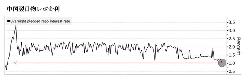 中国翌日物レポが1%割れ