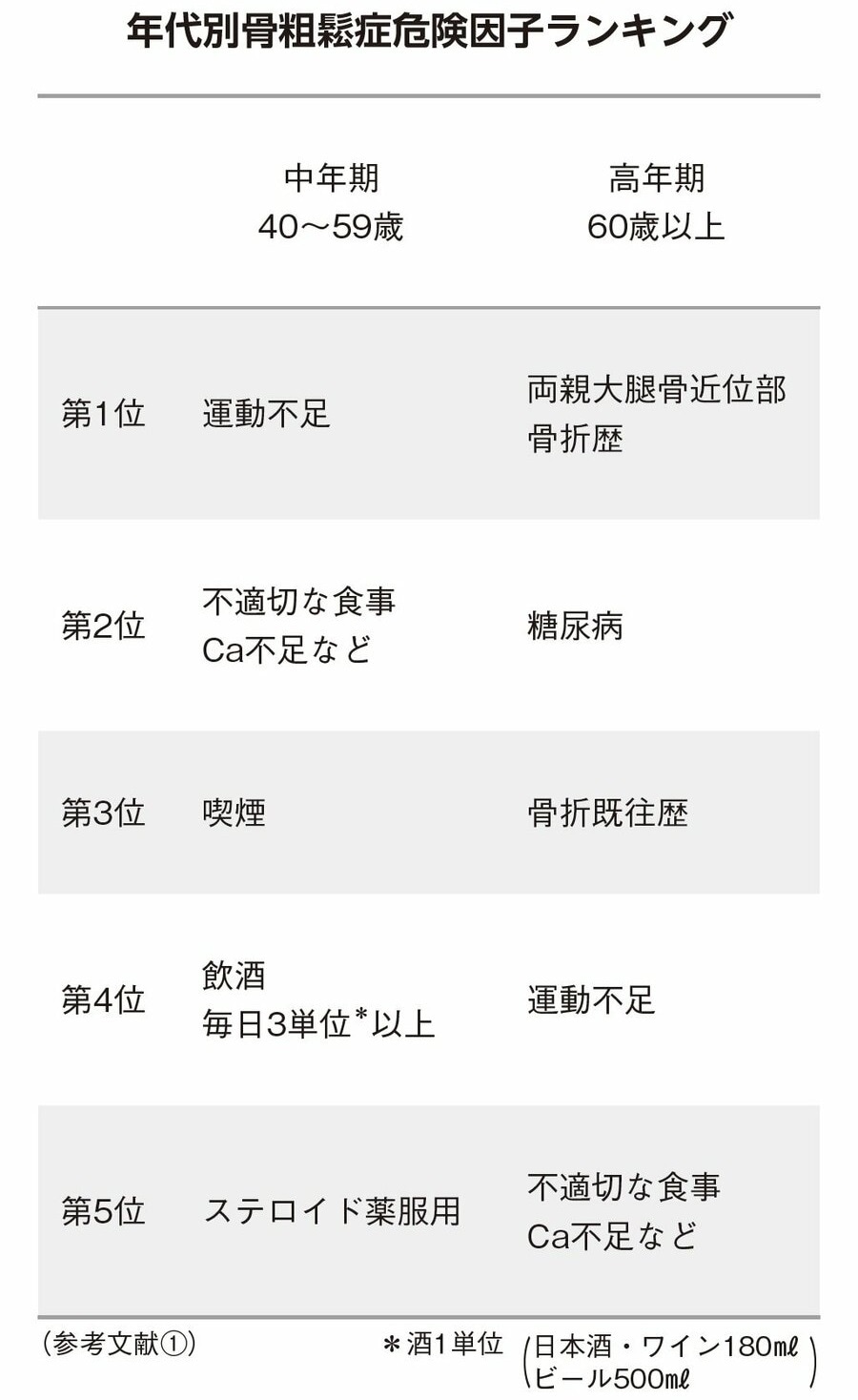 骨粗鬆症危険因子の頻度は年代により変化します。これらのランキングをみてみると、中年期では、運動不足やCa不足などの不適切な食事、そして喫煙や多量の飲酒が最上位を占めています[図表]。これらは除去可能な因子です。