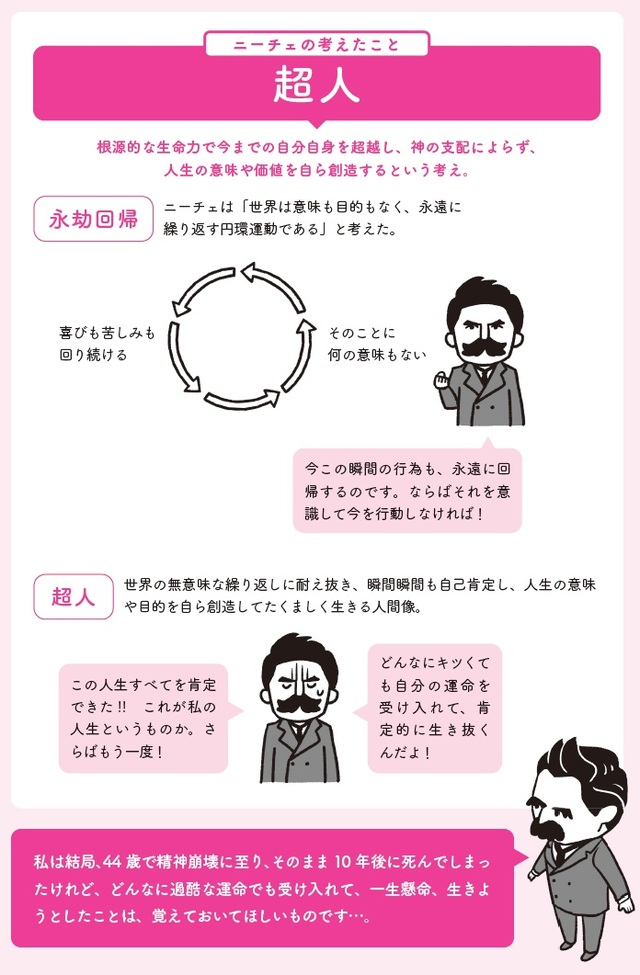 ニーチェ:まず、相談者さんに断言します。世界には意味も目的もありません。そして、世界のすべてのものごとは、意味なく永遠に繰り返す円環運動を行なっています。私はこれを「永劫回帰(えいごうかいき)」と呼んでいます。人間の生の営みも同様で、喜びや苦悩などの体験もただ永遠に回帰します。自分が今行なっている行為も永遠に回帰するのだということを意識してください。こんな頭痛のするような無意味な世界の中では、「なぜ生きるのか」を考える前に、「どう生きるのか」が大切なのです!