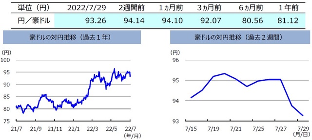 ここ2週間の豪ドルの対円レートは、下落しました。期間中、銅や金等の資源価格が上昇したこと等から、資源国通貨の豪ドルは米ドルに対して強含みました。しかし、7月26、27日に開催された米連邦公開市場委員会(FOMC)で0.75%の大幅利上げが実施され、利上げ幅は市場予想の通りだったものの景気悪化懸念が高まったことによって円高・米ドル安となり、連れて豪ドルの対円レートも下落しました。
