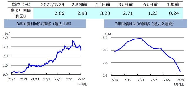 ここ2週間の豪州3年国債利回りは大きく低下しました。急ピッチでの金融引き締めが続く米国で景気悪化懸念が高まってきていることで米国債利回りが低下してきており、連れて豪州の3年国債利回りも低下(債券価格は上昇)しました。